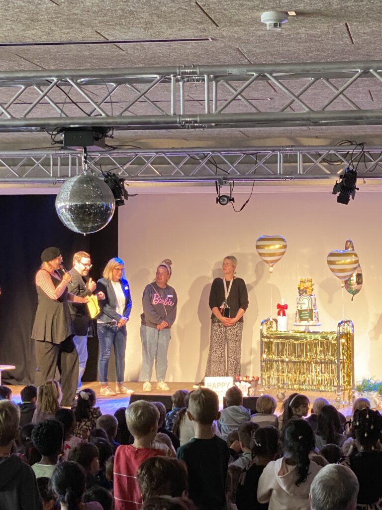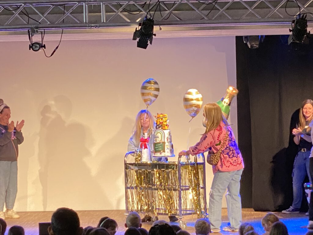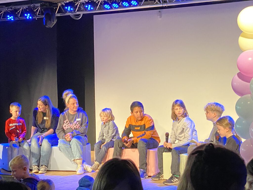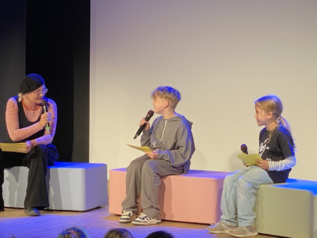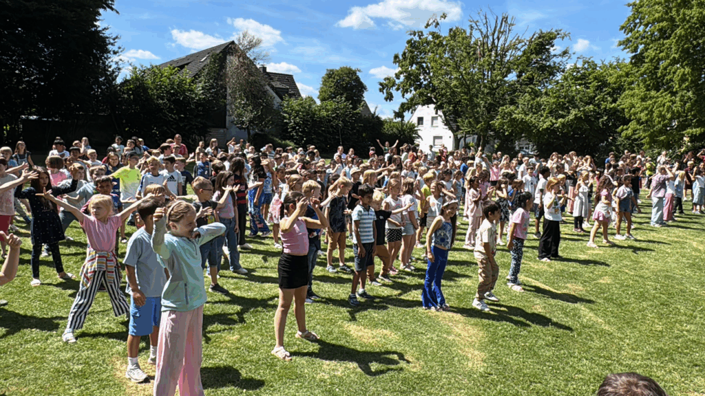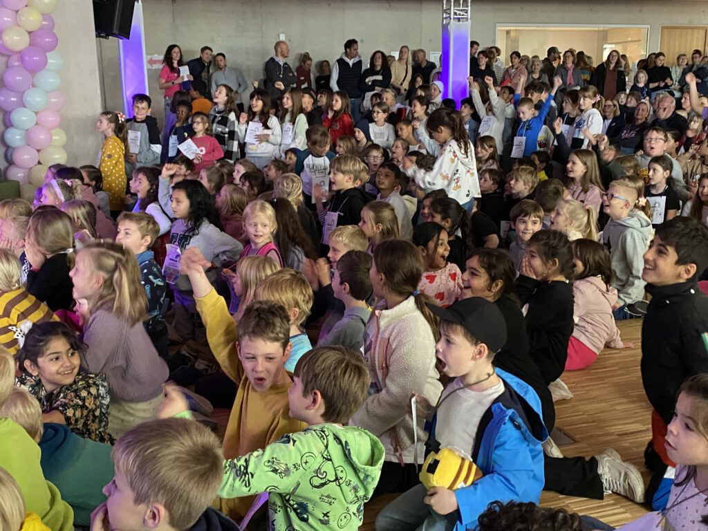 Am 26.09.2025 um 13.00 Uhr war es dann soweit: Unsere Eröffnungsfeier startete in der Aula. Den Anfang machten die KiTa-Kids mit dem Tanz zu dem Lied "Auf uns!" Babette Horschler (Moderatorin bei Antenne Unna und Radio 91.2) übernahm die Moderation gemeinsam mit zwei Kindern unserer Schule (Annie und Henri). So wurden das Leitungsteam, die städtische Verantwortliche für die Begleitung des Neubaus (Frau Olga Goßmann) und unser Bürgermeister (Herr Dirk Wigant) interviewt. Dazwischen gab es immer wieder kleine Programmpunkte, die das ganze Treiben auflockerten.