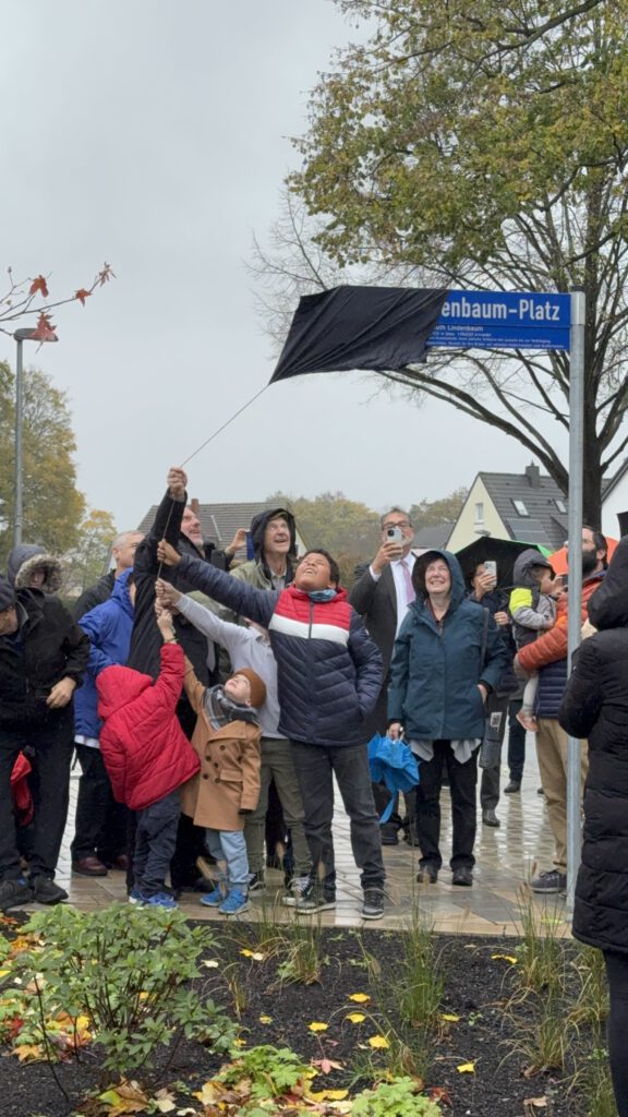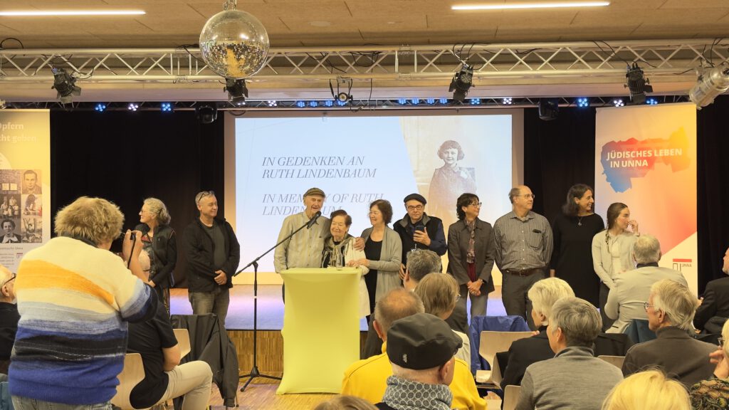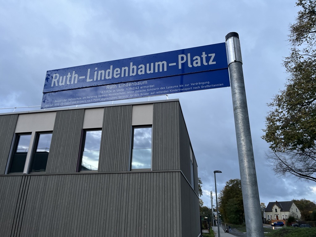 Am 28.10.2025 wurde der Vorplatz unseres Bildungszentrums offiziell in „Ruth-Lindenbaum-Platz“ umbenannt. Dazu reiste Ruths Bruder Manfred Lindenbaum (93) mit seiner Frau, seinen Kindern, Enkeln und Urenkeln aus den USA in seine Geburtsstadt Unna.