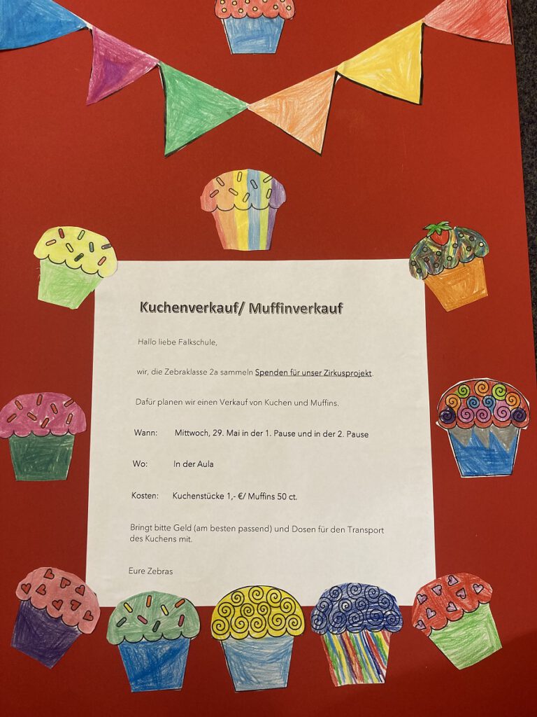 KUCHENVERKAUF AM 29.05.2024 IN DER FALKSCHULE! DIE ZEBRAKLASSE VERKAUFT IN DER 1. und 2. Pause KUCHEN!