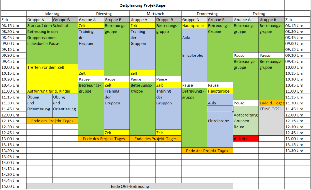 Die Kinder beider Schulen kommen dann in ihren neuen Gruppen zusammen und trainieren gemeinsam für ihre Auftritte. Begleitet werden wir dabei von erfahrenen Zirkusartisten. Ein großes Zelt wird ebenfalls aufgebaut, so dass am Ende dem professionellen Zirkusauftritt nichts mehr im Wege steht.